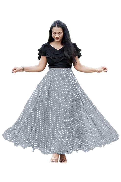 Stylish Ethnic Wear: A polka dot georgette maxi skirt with a flared silhouette and plain lycra crop top, perfect for traditional Indian occasions.